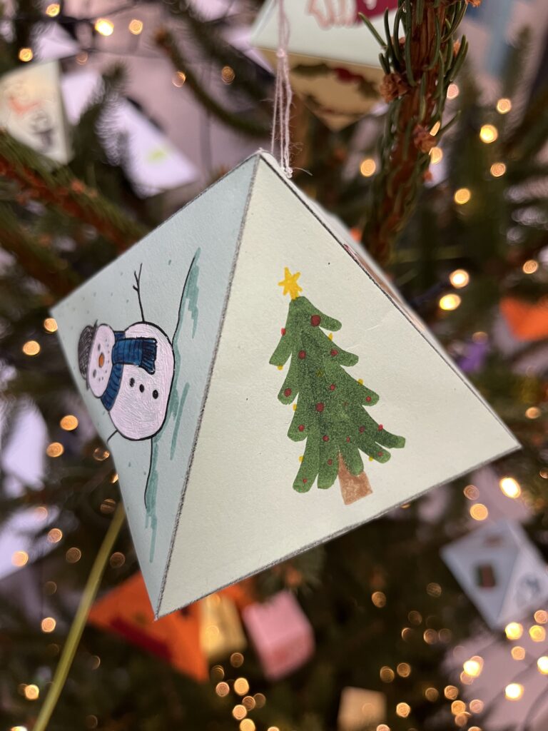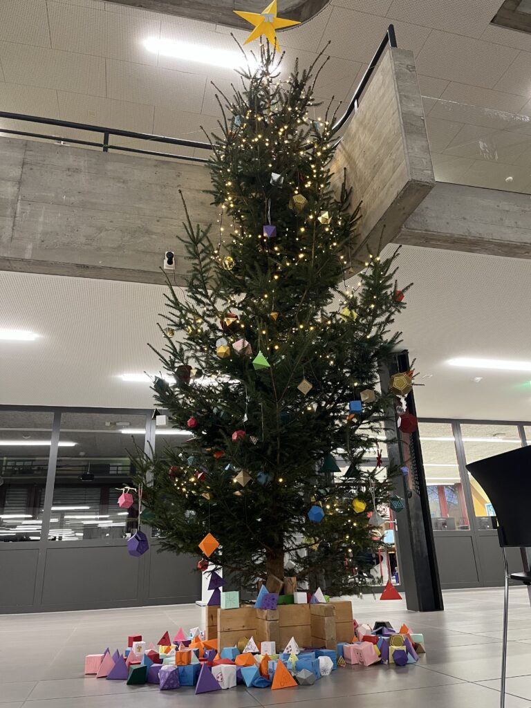 Die Fachschaft Mathematik Oberstufe durfte in diesem Jahr eine ganz besondere Aufgabe übernehmen. Wir hatten die Ehre, den grossen Weihnachtsbaum im Lichthof zu schmücken. Statt herkömmlicher Kugeln entschieden wir uns fachgerecht für eine mathematische Gestaltung. Gemeinsam falteten und verzierten die Schülerinnen und Schüler der MAR-Klassen im Mathematikunterricht alle fünf platonischen Körper aus Papier. Vom Tetraeder zum Dodekaeder bis zur Königsklasse, dem Ikosaeder. Die bunten, geometrischen „Kugeln“ hängen nun als einzigartige Hingucker am Weihnachtsbaum und verbinden die weihnachtlich festliche Stimmung mit mathematischer Ästhetik. Ein kreativer Beweis dafür, dass Mathematik nicht nur logisch, sondern auch schön sein kann.